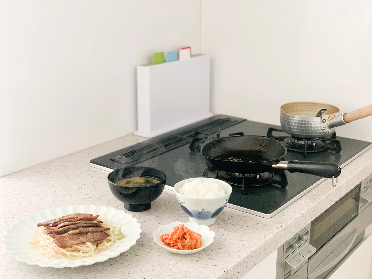 쇠고기를 구워서 미소시루에 밥 한 그릇,