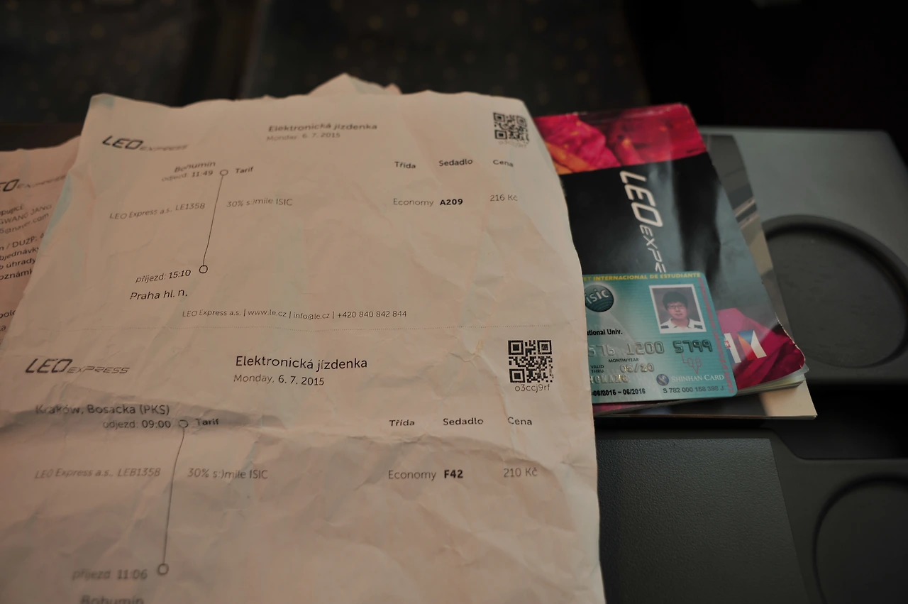 폴란드 크라쿠프에서 체코 프라하로 가는 방법은 여러 가지가 있겠지만 나는 이번에 레오 익스프레스(Leo Express)를 이용했다. 크라쿠프에서 체코 국경 도시 보후민까지는 고속 버스, 보후민에서 프라하까지는 철도를 이용해서 이동하는 시스템을 갖춘 회사였다. 시간은 제법 걸리는 편이지만 가격이 저렴할 뿐더러 학생 할인이 어마어마했다. 30퍼센트 할인 받고 416 코루나였으니 한국 돈으로 2 만원이 되질 않는다. 사실 내가 할인받은 옵션 smile isic 같은 경우는 smile 멤버쉽 카드를 발급 받은 뒤에 국제 학생증과 함께 사용가능한 것이어서 버스 탑승할 때 기차에서 카드 결제하라고 직원이 말했었다. 왠일인지 기차에선 그냥 패스. 어차피 멤버쉽이야 회원가입하고 휴대폰 발급 가능하니 굳이 체크하지 않았던 것 같다. 난 휴대폰이 없었는데. 헤헤