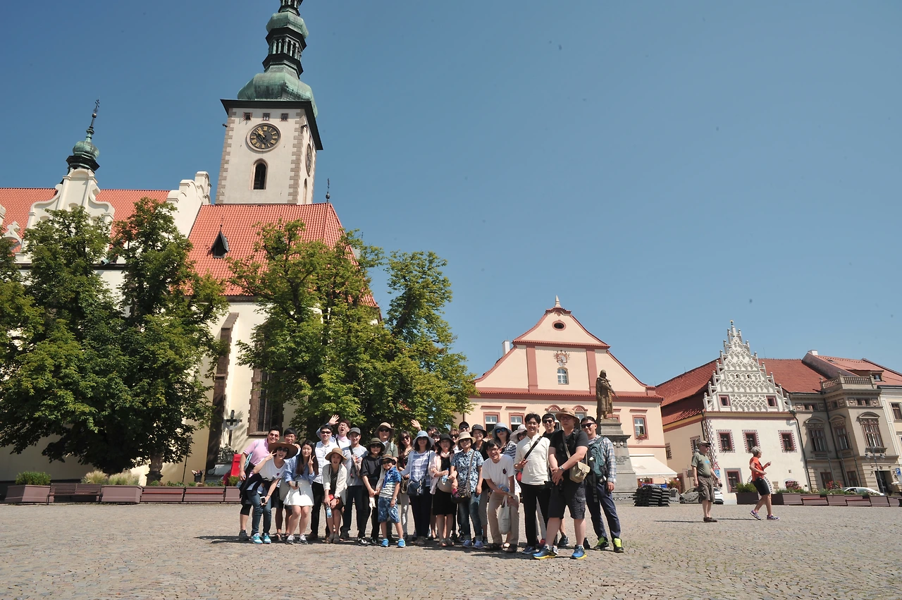 지슈카 광장에서의 단체 사진. 뒤편에 보이는 동상은 후스파의 리더, 외눈의 장군 얀 지슈카의 동상이다. 불패의 전설로 유명한 체코의 명장.
