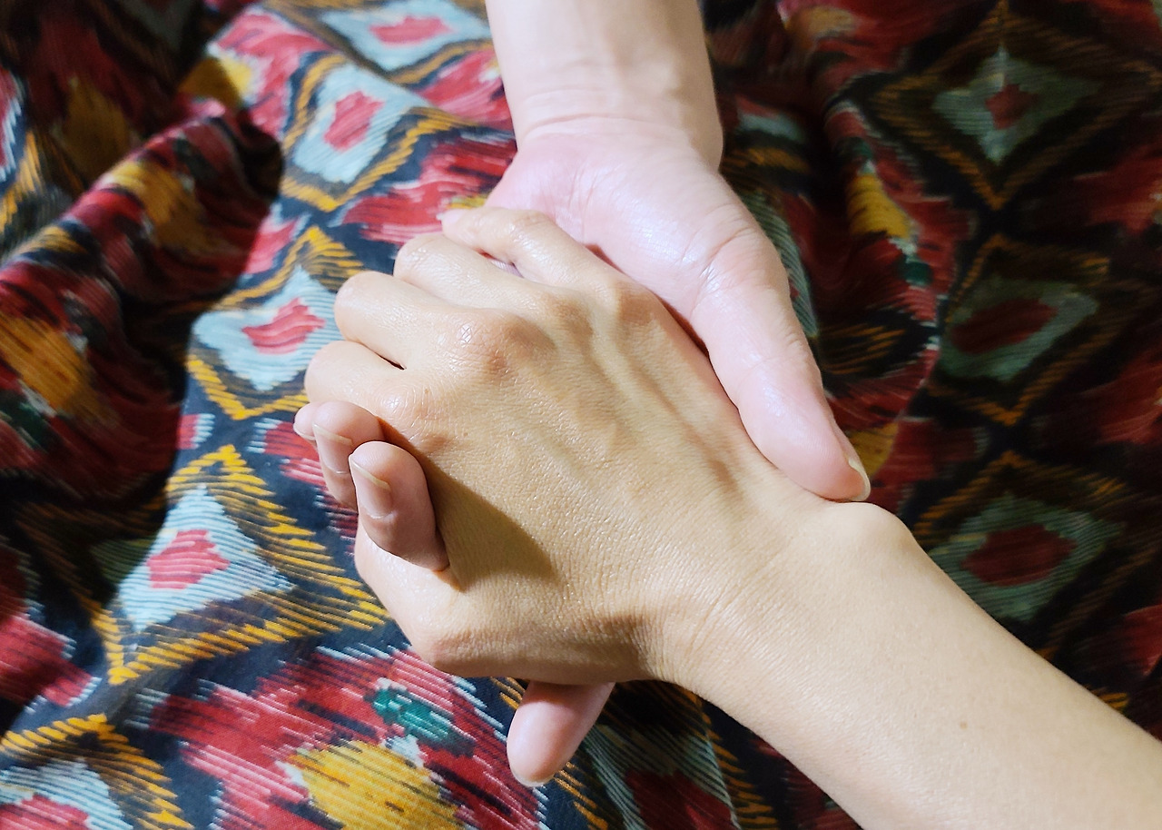남자 손을 아래에 두고 여자 손을 얹는다.