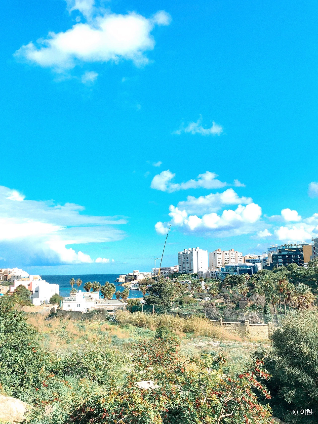 웬 도로의 사진을 뜬금없이 찍어놨나 싶으시겠지만, 공교롭게도 저기는 버스정류장이다. 버스 정류장이라는 표지판 하나 정도는 길가에 꽂혀있다.(사진에 담지는 못했다.) 돌담을 벤치 삼아 앉아서 아침 등교 버스를 기다리고 있자면, 등 뒤로는 오른쪽과 같은 멋진 바다의 풍경이 펼쳐진다. 미켈란젤로의 작품 같이 유럽 고전 명화에 그려진 몽글몽글한 구름들은 모두 작가의 상상인 줄로만 생각했는데, 지중해에 와보니 정말로 구름들이 몽글몽글한 것이 감탄스러웠다. 아름다운 바다의 절경은 수평선과 맞닿은, 그 위로 이어지는 하늘의 풍경이 완성시켜 주는 듯했다.