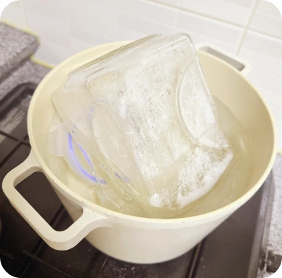 열탕소독을 하고 자연건조까지 시간이 걸리니, 유리병부터 소독하기로 한다. 물이 끓고 나서 유리병을 넣으면 깨질 우려가 있으므로, 상온수를 받아 유리병을 넣고 불을 올려 서서히 열이 전달되도록 해야 한다. 물이 끓기 시작하고부터 5~10분 정도 더 끓여 열탕소독을 한다.