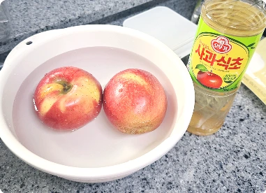 사과를 물에 담그고 식초를 두 바퀴정도 둘러준다. 10분 정도 담가두었다가 다시 물에 잘 씻어준다. 키친타월로 물기를 잘 닦아준다.