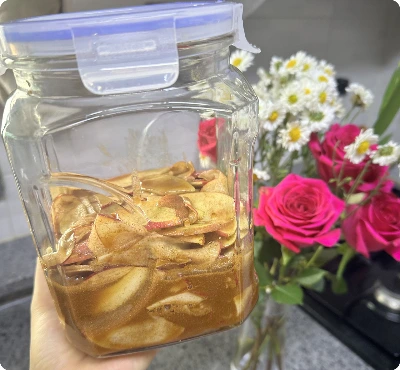 애플시나몬청은 보통 따뜻한 차로 많이 마신다. 나는 차에 남은 사과청을 잘 먹지 않는 스타일이다. 아작아작 씹어먹는 식감이 좋다면 조금 두껍게 썰었을 테지만, 나는 사과맛이 잘 우러났으면 해서 얇게 썰었다.