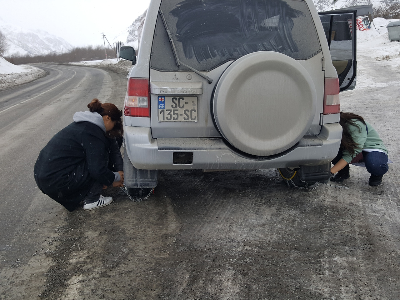 들어올 때는 마음의 준비 없이 눈을 만나서 반갑기도 하고 재미 있었는데 가는 길에는 현실감을 찾아 겁이 났다. 계속 눈이 내리고 있는 상황에서 2,000m가 넘는 구다우리를 잘 넘어갈 수 있을까 하는 걱정에 체인을 감았다가 다시 도로 사정에 맞춰 풀었다를 반복했다.