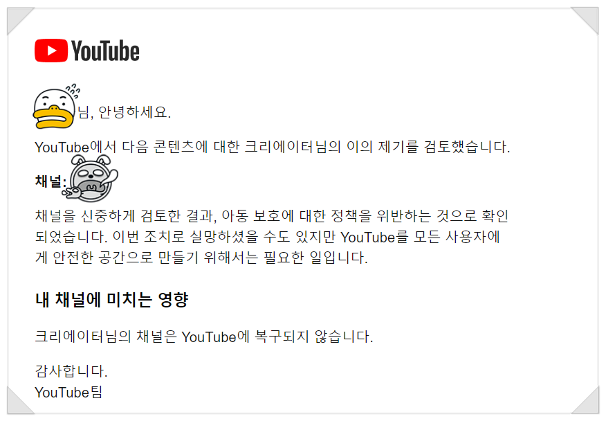 이때 이미 유튜브는 내 Gmail 계정으로 1차 경고 메일을 발송했으나, 몰랐다.
