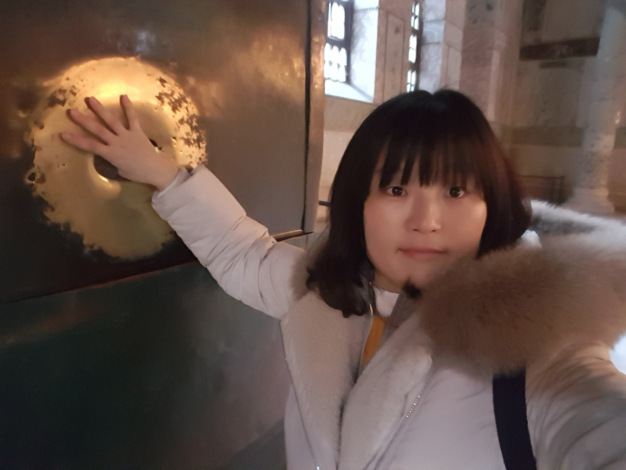 소원의 기둥, 엄지를 넣고 손이 떨어지지 않은 채 360도를 돌리면 소원이 이뤄진다는데. 덕분에 손크기만큼 반질반질