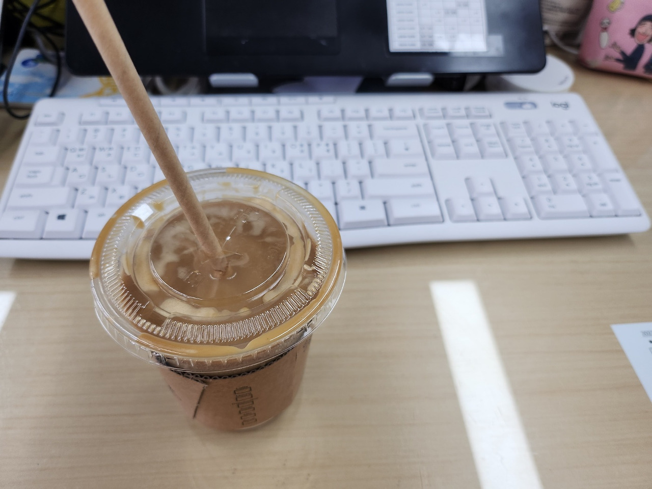 출처를 알 수 없는 아이스카페라떼가 놓여있었어요.