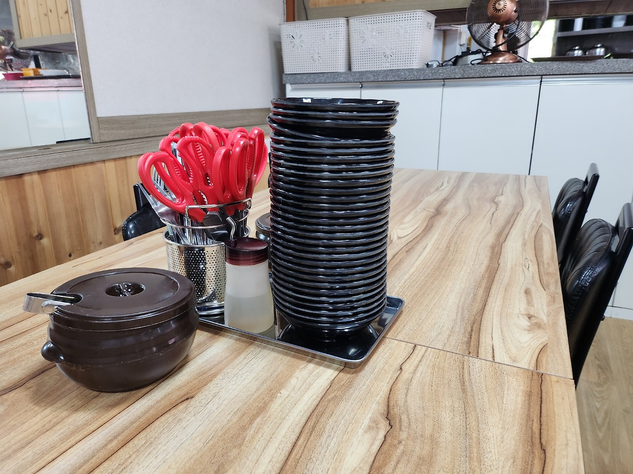 처음 왔을 때는 좌식이었는데 현재는 신발 벗고 의자에 앉도록 바뀌었어요. 기본 수저, 젓가락은 식탁 밑에 있고 아이들을 위해 포크와 가위 등은 테이블 위에 있습니다. 분명 셀프일텐데 친절한 사장님이 하나하나 챙겨주세요. 앞치마도 가져다주시고 세심하십니다.