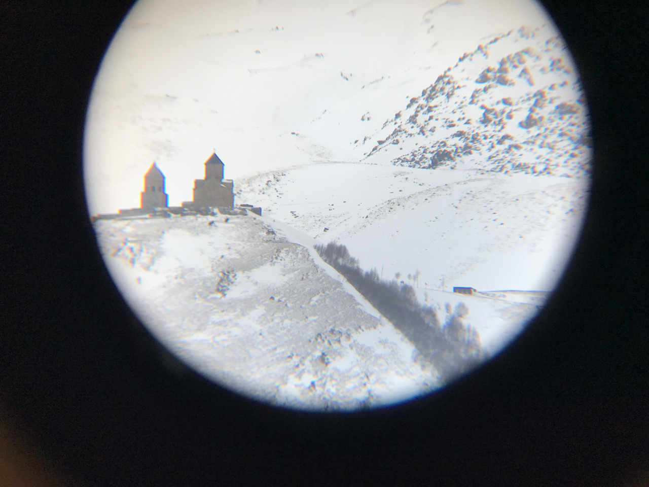 호텔 로비에 있는 망원경으로 바라본 게르게티 츠민다 사메바 성당인 성 삼위일체 성당(Gergeti Trinity Church)