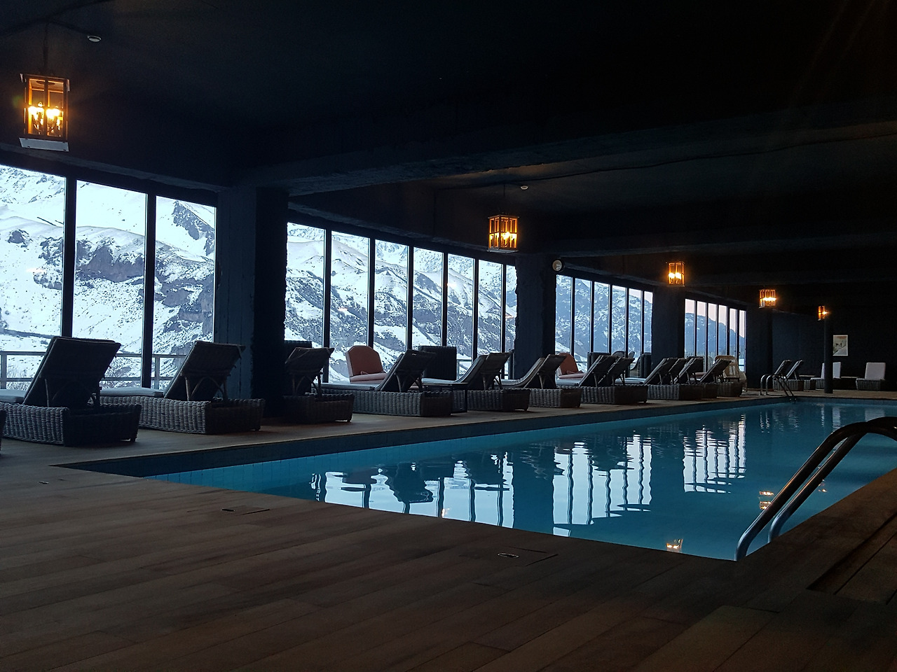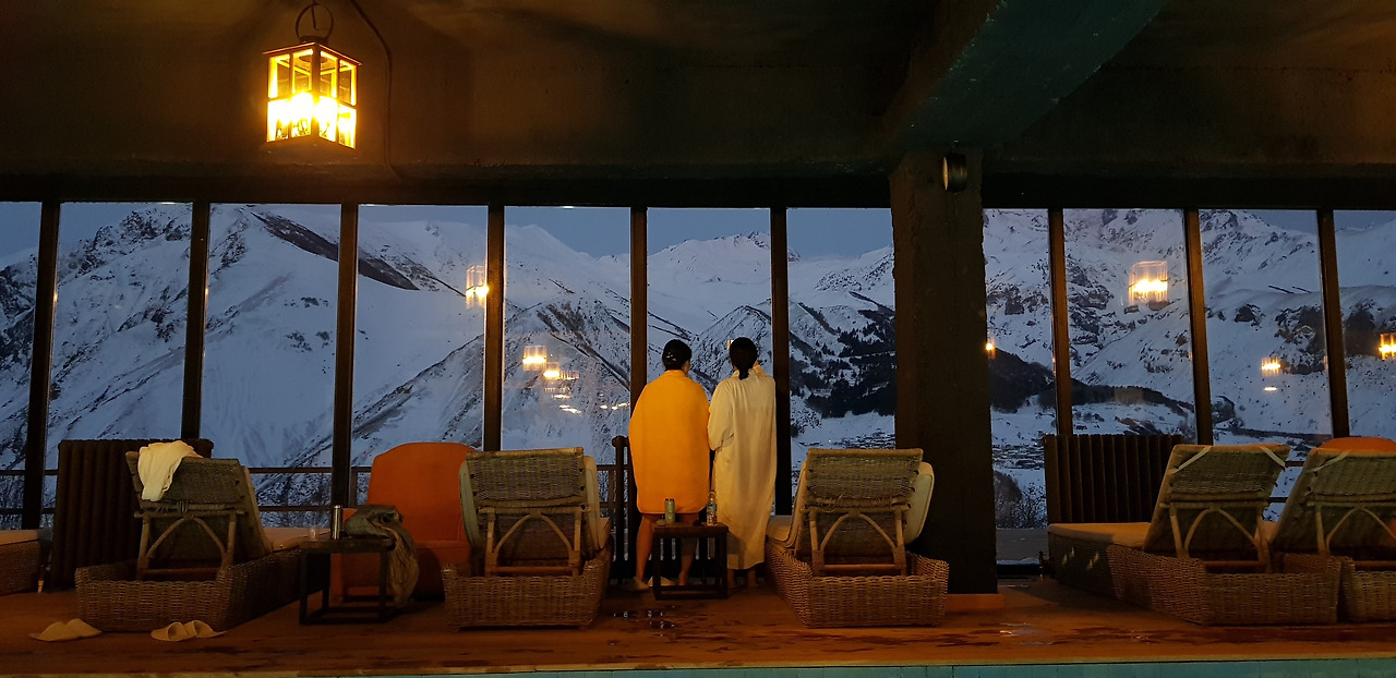 수영장 전면창으로 카즈베기 산이 한눈에 들어온다.