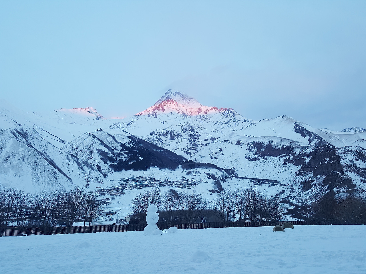 낮에 테라스에서 볼 수 있는 카즈베기산의 모습도 아름답지만 이른 아침과 저녁에 보는 모습은 또 색다르다.