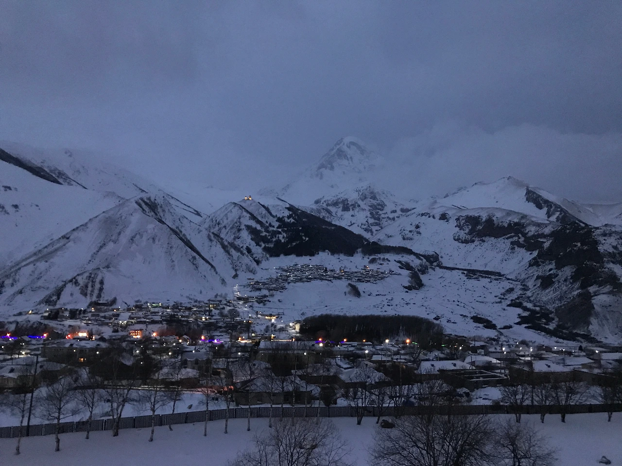 룸스에서 보이는 저녁 마운틴 뷰. 산 아래 스테판츠민다. 게르게티 성당에서 불빛이 밝혀져있다.