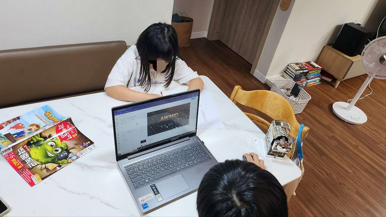 아들은 미리캔버스를 이용하고, 딸은 손그림 작업을 시작했습니다.