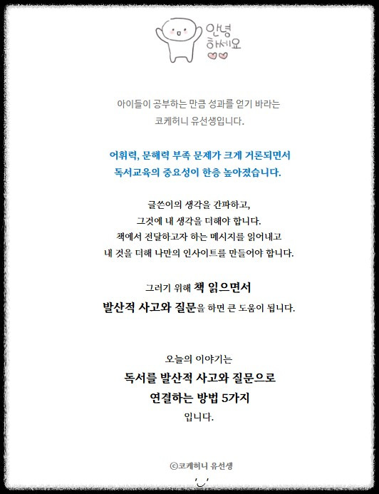 1️⃣ 진짜 공부가 되는 집공부 비법을 글로 나눕니다. 2️⃣ 많이 아는 아이 말고, 많이 궁금한 아이를 위한 체험학습을 합니다. 3️⃣ 재미있어서 책 읽는 아이, 곁에서 같이 읽는 엄마 입니다.