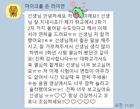 같이 마지막을 고생한 고3담임도 아니고 지금은 다른 학교로 전근 가서 얼굴도 못 보는데 기억했다가 기쁜 소식을 나눠준다는 건 교사로서 더없이 감사한 일이다. 아이들이 얼마나 인내하며 노력했는지 지켜본 사람이기에 이들이 합격의 기쁨을 마땅히 누릴만하다는 걸 안다. 온 마음을 다해 축하했다. 내 자식이 합격한 거인냥 기쁘고 대견하다.