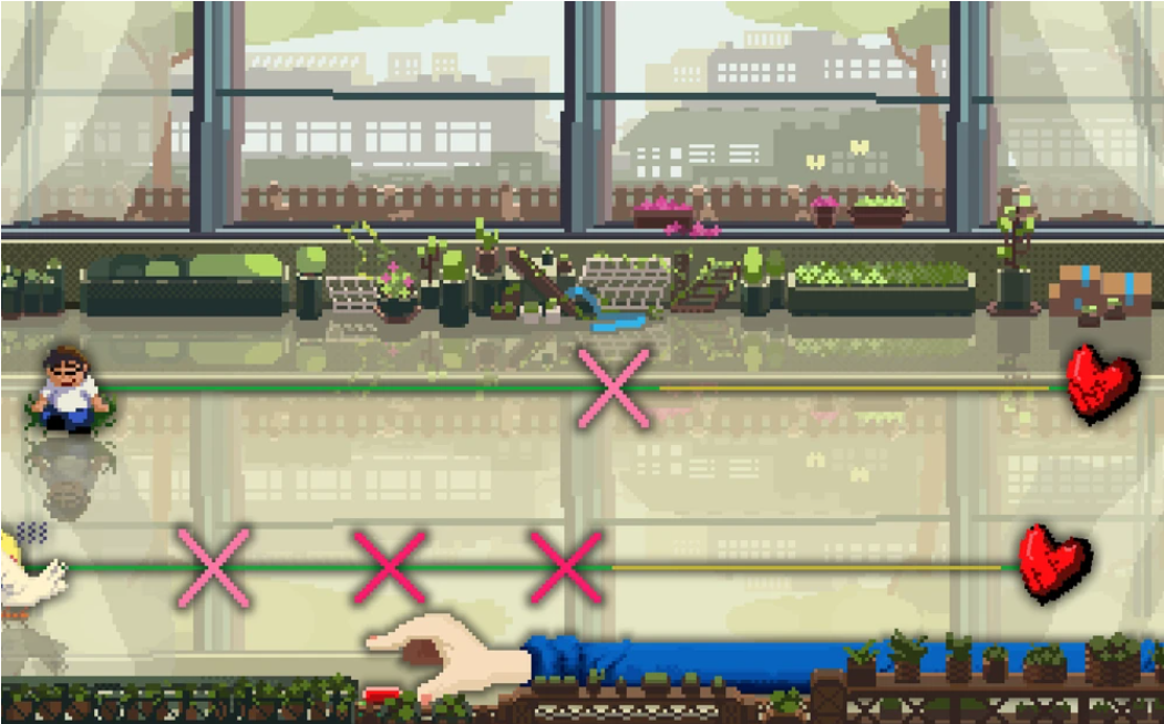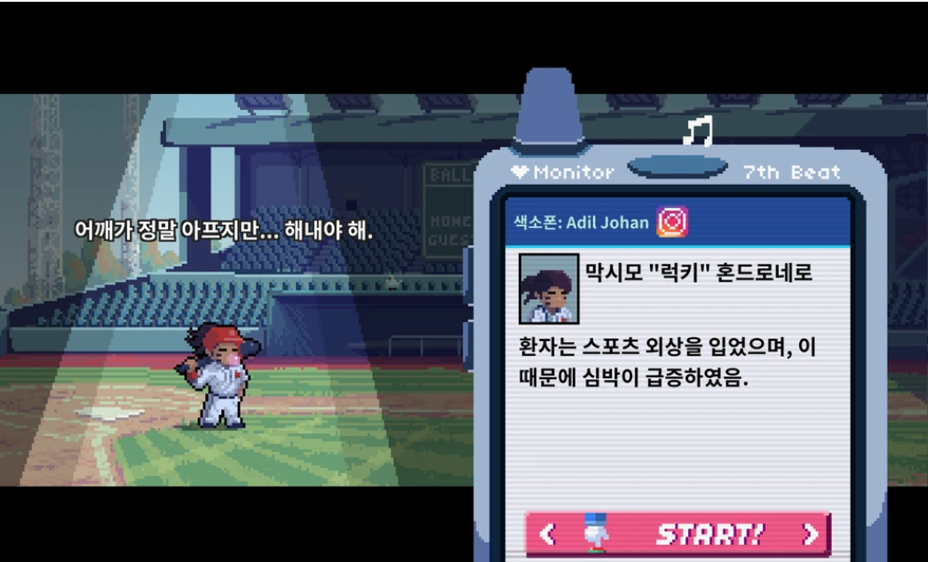 <리듬닥터>에서 상대의 심장 박동에 주의를 기울이며