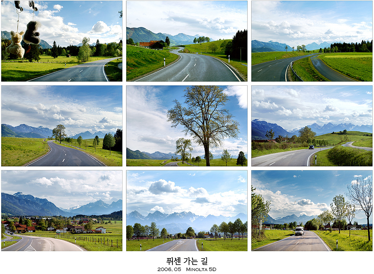 위 사진은 오스트리아 인스브루크에서 퓌센을 가는 길 달리는 차 안에서 셔터 스피드만 올리고 무작정 찍은 사진들 입니다. 졸면 아깝다는 말이 이해가 기시죠? 퓌센의 풍광이 아름답다고는 하나 알프스의 핵이 되는 스위스를 둘러싸고 있는 나라들의 접경지역은 나름대로 모두 아름답다고 봐야 합니다. 그중에 유독 퓌센이 유명한 이유는 바로 백조의 성이라 불리는 노이슈반스타인이라는 성 때문입니다. 이 성의 사진을 책이나 엽서에서 한 번쯤은 보았을 겁니다. 특히 디즈니가 이 성을 모델로 로고로 만들었다는 소문이 나서 더 유명해졌습니다.