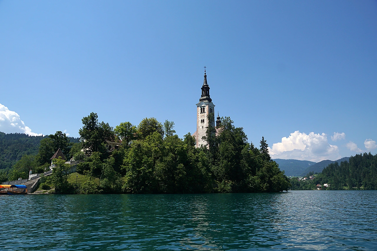 섬 안에 있는 성모승천 성당 (The Church of the Mother of God). 저곳을 가시려면 블레드의 명물 ‘플레타나(Pletana)’라고 불리는 나룻배를 타야 합니다. 플레타나는 뱃사공이 직접 노를 저어 섬으로 데려다주는데 이 뱃사공도 베네치아 곤돌라 뱃사공처럼 장인만 할 수 있습니다.