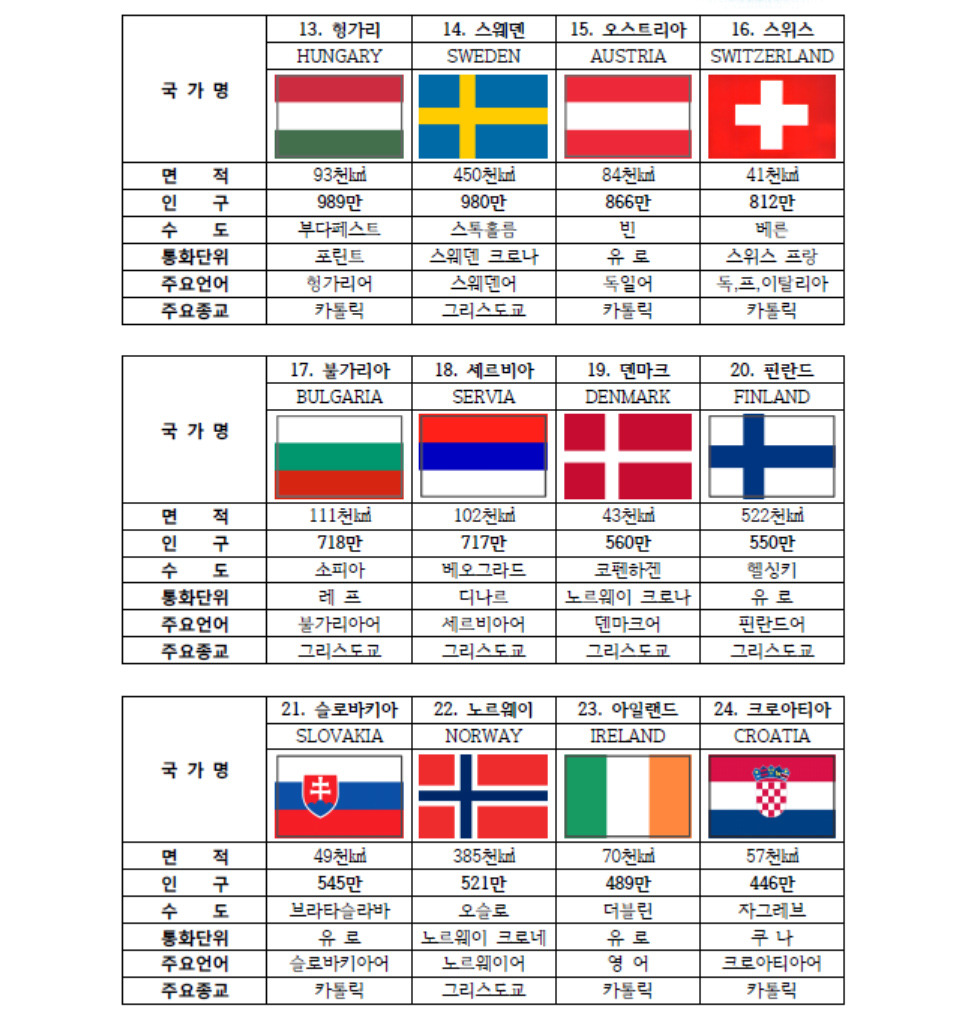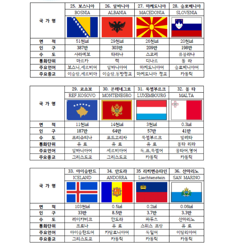 주 내용은 유럽 38개국의 국기 / 면적 / 인구수 / 수도 / 통화단위 / 사용언어 / 주요 종교입니다.