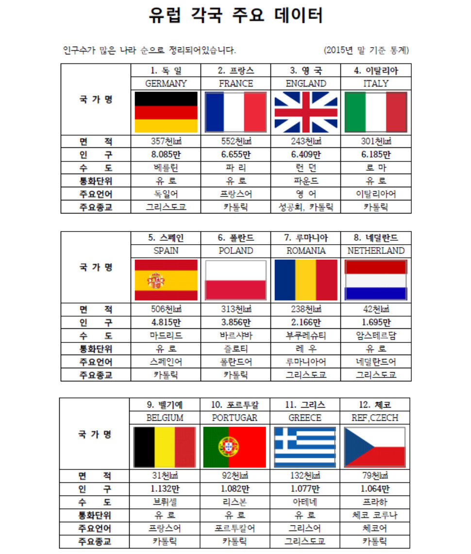 유럽 각 나라 주요 데이터를 정리해 두었습니다. (2015년 말 기준 통계입니다)