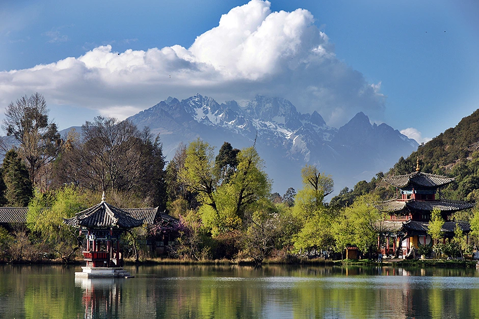가장 기억에 남는 마지막 풍경을 묘사해 보겠습니다. 저 멀리 하얀 설산이 보이고, 하늘엔 흰 구름이 두둥실 떠서 설산 머리를 다소곳이 가리고 있습니다. 너무도 맑은 호수 위에 하얀 다리가 무지개처럼 걸려 있고 그 끝엔 활시위처럼 휜 추녀를 가진 누각이 보입니다. 단조로운 호수 속에 신선이 자리 잡을 만한 육각 정자도 사뿐히 내려앉아 있습니다. 호수 주변엔 연두색 미루나무가 보이고 복사꽃이 만발한 시기에 그려진 춘삼월 풍경입니다. 무언가를 더 그려 넣어도 안 되고, 빼도 안 되는…. 조영남의 화계장터처럼 있어야 할 것은 다 있고 없을 건 없습니다. 한마디로 말하자면 완벽 그 자체여서 오히려 외계 같은 그림입니다.