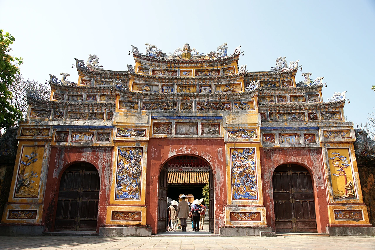 1804년부터 지어진 후에 왕궁은 중국의 자금성을 모델로 하여 만들어졌습니다. 가로와 세로 2km 반경에 5m 높이의 성을 쌓고 그 바깥쪽에 해자를 파서 향강에서 물을 끌어 드린 성채입니다. 태화전을 중심으로 정확하게 좌우 대칭으로 이루어진 성채는 선왕의 위패를 모신 지역, 여자들이 거주하는 지역, 왕의 처소와 교육기관 등으로 나누어져 있습니다. 월남전 당시 심각하게 파손되었으나 서서히 복원 작업을 진행하여 옛 모습이 되살아나고 있습니다.