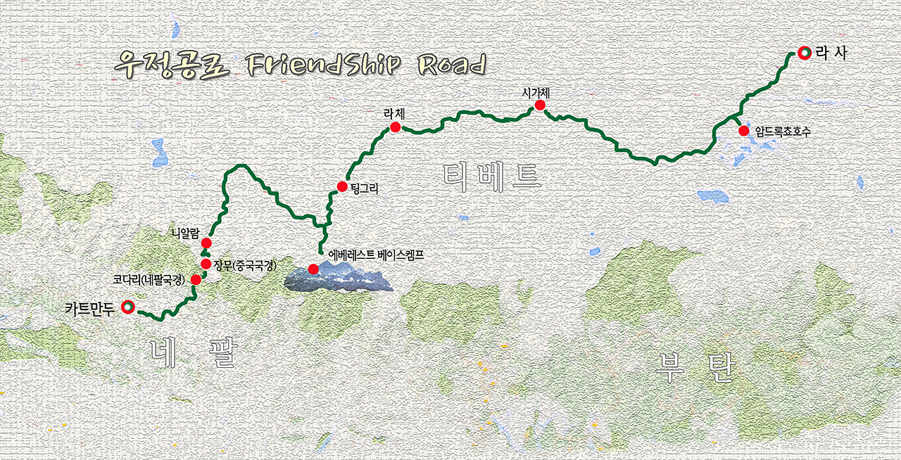 우정공로 Friendship Road!! 도로 이름이 아주 멋집니다. 티베트의 수도 라사에서 네팔의 수도 카트만두를 연결하는 도로 이름입니다. 공식적인 거리는 920Km, 가는 길에 암드록쵸 호수와 에베레스트 베이스캠프를 들른다면 1,100Km는 족히 되는 거리입니다.