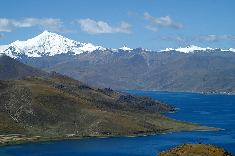 이 호수를 가는 길도 그리 만만치 않습니다. 라사를 벗어나 공항 쪽으로 가는 라사 강 (야루짱부강의 지류)을 따라가다 산길로 접어듭니다. 힘겹게 깜빨라 고개를 넘을 때까지 산 위에 호수가 있으리란 예상을 하기 어렵습니다. 큰 고개를 오르면 설산에 둘러싸인 호수가 나옵니다. 차가 지나온 곳의 고도는 4,794m입니다. 호수가 상당히 크고 복잡하게 구성되어 다 돌아보기엔 무리입니다. 호수 지대는 해발 4,400m, 면적은 640㎢에 달하여 대부분 뷰포인트에서 전망을 보고 내려옵니다. 멀리 보이는 큰 봉우리는 해발 7,191m의 노진캉창산입니다. 라사 시내에서 이곳까지 오는데 1시간 반에서 2시간 정도 소요됩니다.