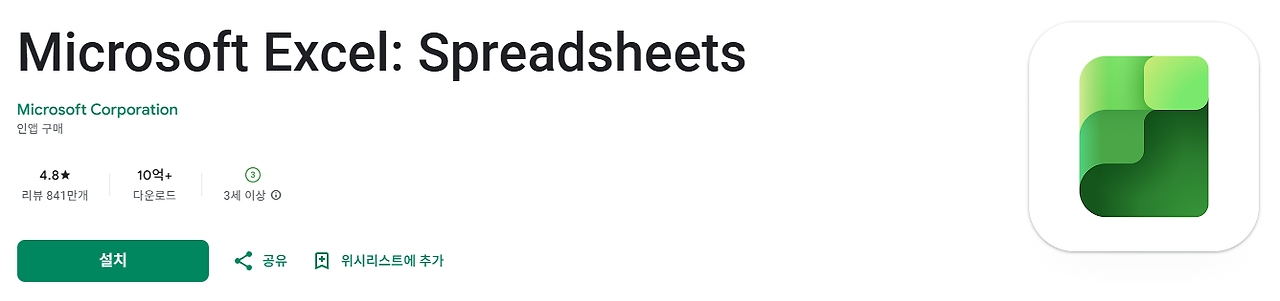 다운로드: 구글 플레이스토어에서 'Microsoft Excel' 검색 → 무료 설치