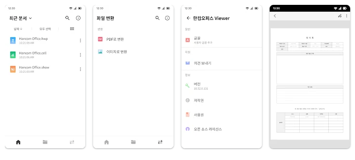 공식 개발사 앱이라 레이아웃 재현율이 가장 높습니다. 복잡한 표나 특수 폰트가 있는 문서도 원본에 가깝게 보여줘요.