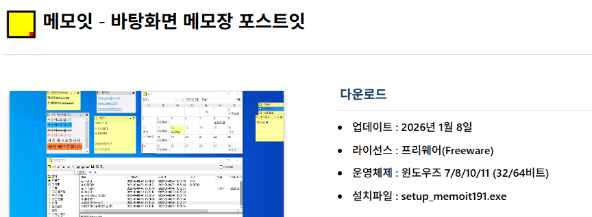 메모잇(Memoit)은 바탕화면에 포스트잇 형태로 메모를 붙일 수 있는 윈도우 전용 프로그램입니다. 개인 개발자가 프리웨어로 배포하고 있어서 누구나 무료로 사용할 수 있습니다.