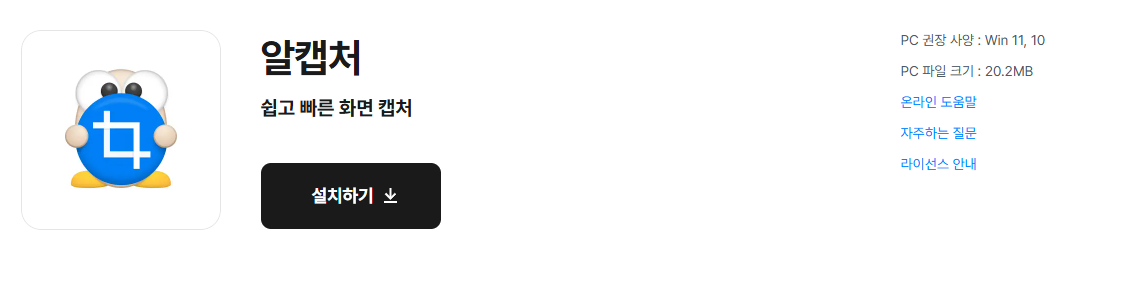 공식 홈페이지 altools.co.kr에 접속해서 알캡처 메뉴를 클릭하면 됩니다. 다운로드 버튼 누르면 설치 파일이 바로 받아져요. 최신 버전은 3.23이고 용량은 약 20MB입니다. 윈도우에서만 사용 가능합니다.