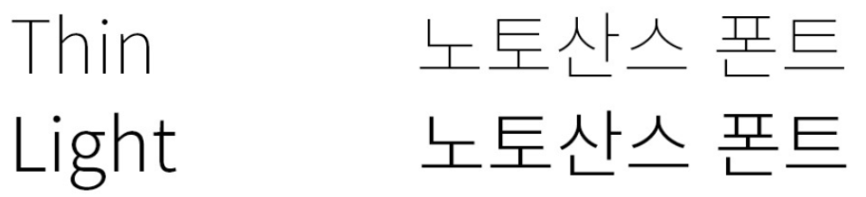 노토산스의 장점 중 하나가 굵기가 다양하다는 거예요. Thin / Light / Regular / Medium / Bold / Black 총 6가지의 굵기를 지원해요. Thin 100, ExtraLight 200, Light 300, Regular 400, Medium 500, SemiBold 600, Bold 700, ExtraBold 800, Black 900 등 9가지 폰트를 제공하는 버전도 있어서 제목용, 본문용 따로 골라 쓸 수 있어요.