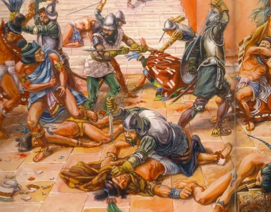 그런데 이 비극적 사건은 이미 데자뷔에 불과합니다. 1520년 멕시코에 상륙했던 코르테스 일행은 자신들을 신의 사자로 환대했던 아즈텍 황제 목테수마를 궁전에서 인질로 잡고 귀족들을 학살했다 일어난 반란으로 '슬픈 밤'(Noche Triste)이라고 불리는 비참한 패배를 경험하게 됩니다. 그러나 물러났던 코르테스는 1년 후 다시 돌아와 아즈텍 제국의 수도 테노치티틀란을 완전히 정복하며 찬란했던 제국은 멸망하고 식민지 주민들은 노예처럼 착취당하며 살아가게 됩니다.