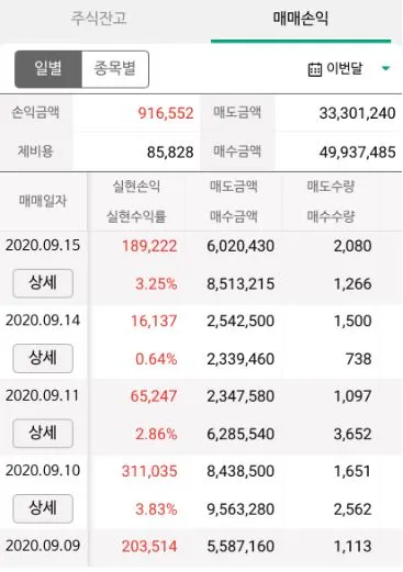 위 목적에 따라 시도해 본 9월의 첫 2주 동안 수익률은 단타 매매 기준으로 현재까지는 나쁘지는 않은 것 같습니다. 아래는 실제 매매 수익을 캡처한 화면입니다. 상단의 매도/매수 금액은 15일간의 총합계 금액으로 얼핏 보면 많아 보이지만 실제로는 자금 회전율이 높기 때문입니다.