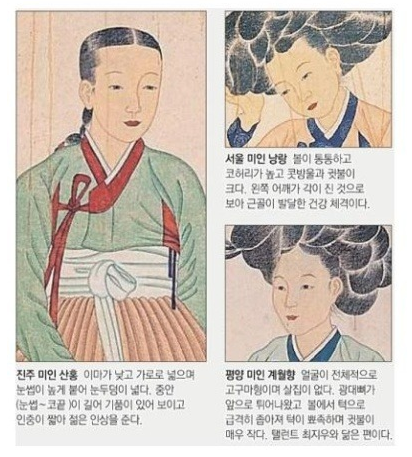 전반적으로 인중이 짧고 양 볼이 통통하며 계란형의 얼굴보다는 고구마형이 선호되었던 듯싶습니다.