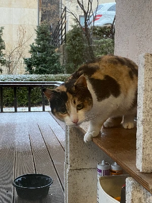 배부른 고양이가 떠나지않고, 문앞에서 살짝 졸고있다. 그 뒤엔 눈발이 흩날리는 아침.