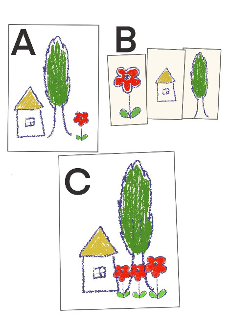 디지털 아트에서는 그림 B와 같이, 집, 꽃, 나무 등의 요소를 각각의 레이어에 따로 그린 후, C 그림처럼 크기와 배치, 복제 등을 가감하여 그림을 완성시킨다.