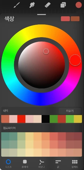 편집모드의 가장 왼쪽에 보여지는 동글라미는 컬러를 선택하는 팔레트를 열어준다. 컬러를 선택하고, 내가 선택한 컬러를 저장해두고 다시 꺼내쓸수도 있다. 컬러를 선택할 수 있는 여러 모드를 제시하는데, 디스크, 클래식, 하모니, 값, 팔레트 등의 모드안에서 내가 원하는 컬러를 열 수 있다. 자세한 내용은 페이지를 살펴보자.