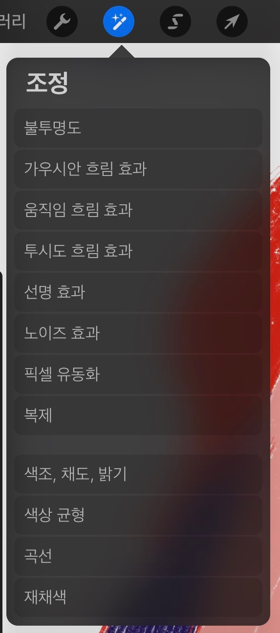 이번장의 내용은 프로크리에이트의 조정 메뉴를 설명한다.
