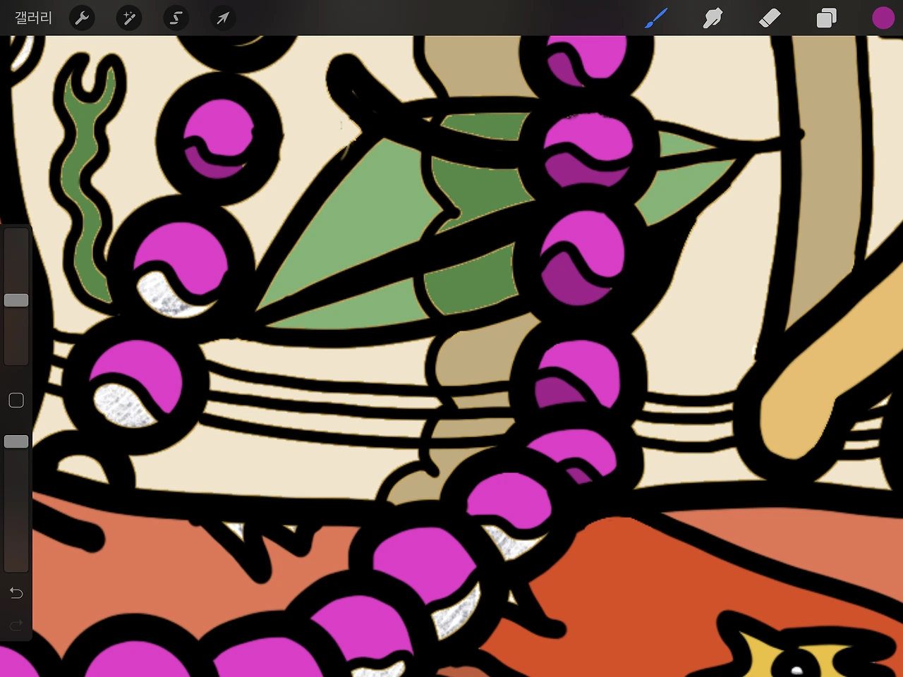 7. 컬러링을 마쳤으면 밋밋한 컬러 위에 점이나 사선 등의 검은색 무늬를 그려넣어 그림을 완성한다. 화면을 확대하여 꼼꼼히 채색하고, 검은색 라인끝을 깔끔하게 정리하면서 그림을 마무리한다.