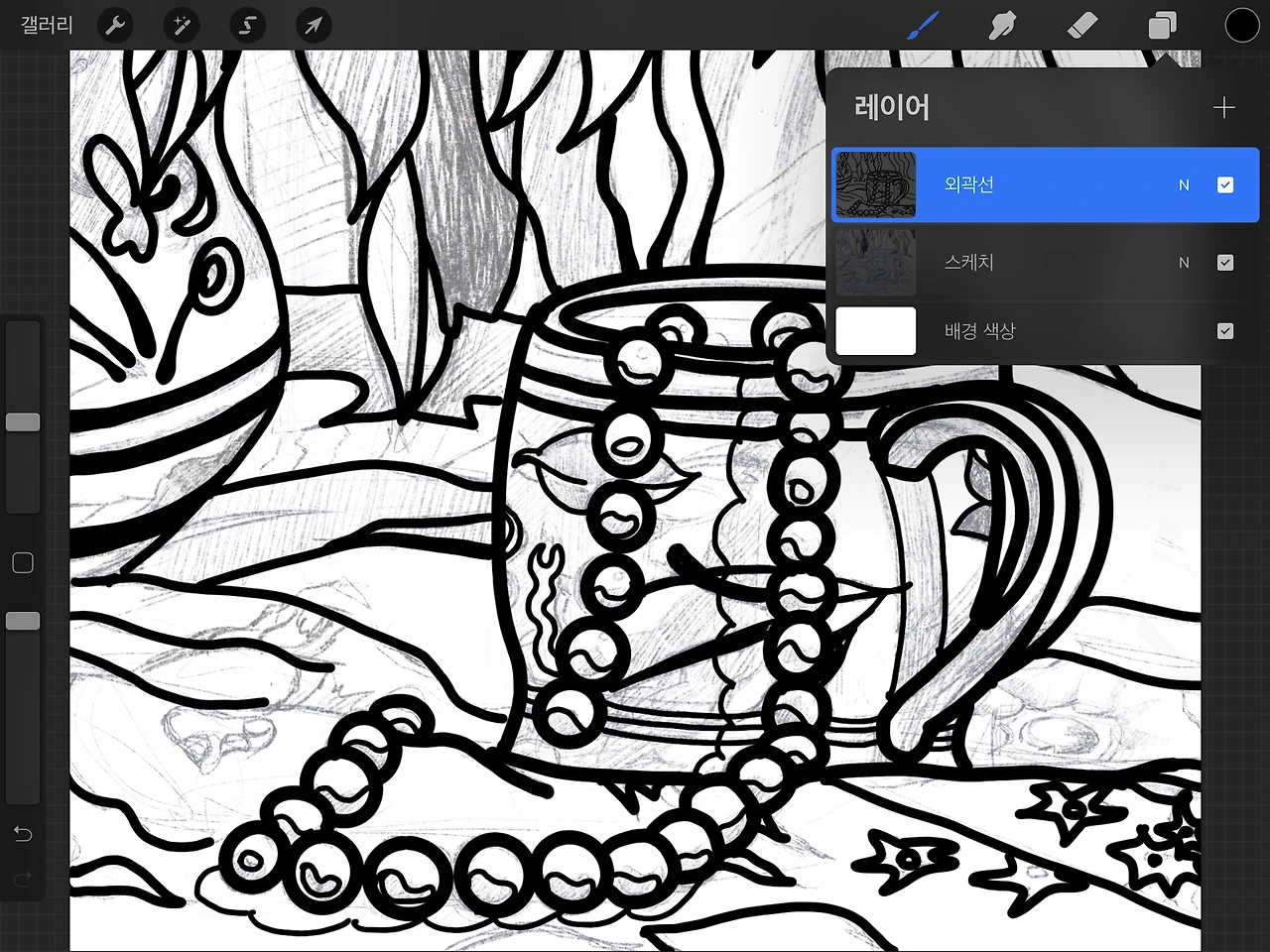 4) 스케치한 내용을 따라서 전체를 검정색 선으로 깔끔하게 따라 그린다. 주의할 점은 컬러드롭을 할 부분은 반드시 폐곡선을 만들어주어야 한다. 어딘가 빈틈이 있는 경우, 컬러드롭에 실패한다.