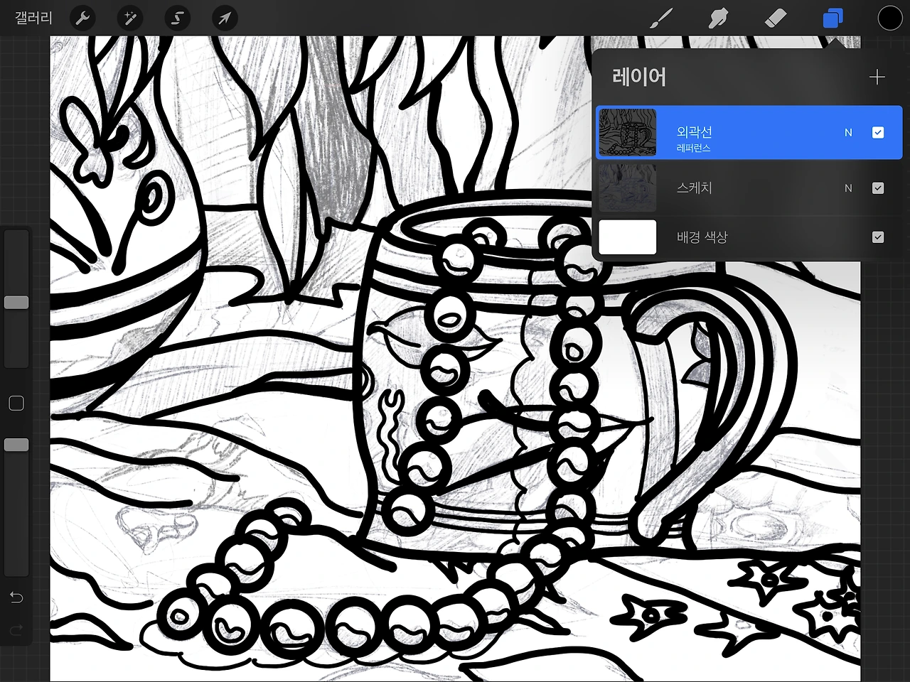 3. 외곽선 레이어를 살짝 터치하면 레이어 옵션 메뉴가 나타난다. 여기에서 레퍼런스를 체크한다. 레이어이름 아랫쪽에 작은 글씨로 레퍼런스라고 표기됨을 확인한다.