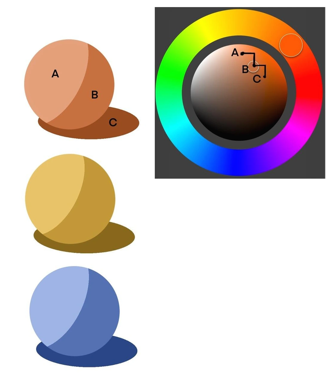 만화기법으로 그림을 그릴 때 어떤 사물의 어두움을 표현해야 한다. 이때 어떤 색을 고르느냐에 따라 자연스럽게 보일수도 있고, 생뚱맞게 느껴질 수도 있다. 디스크 컬러인터페이스 또는 클래식 컬러 인터페이스에서 특정컬러의 어두움 컬러를 선택할 때 기억자(ㄱ)위치의 컬러를 선택하면 비교적 자연스러운 어두움 컬러를 선택할 수 있다.