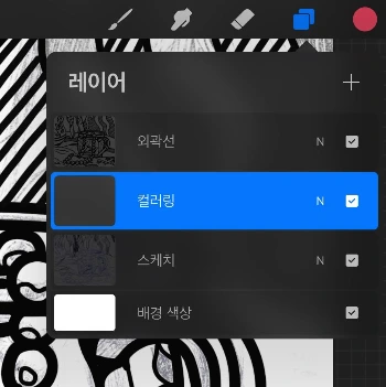 4. 채색할 레이어를 +를 눌러 새로 생성한 후, 외곽선(레퍼런스)레이어 아랫쪽으로 위치이동 시킨다. 레이어를 눌러 아랫쪽으로 끌어당긴 후, 놓는다. 채색 레이어에 이름을 컬러링이라고 변경한다.