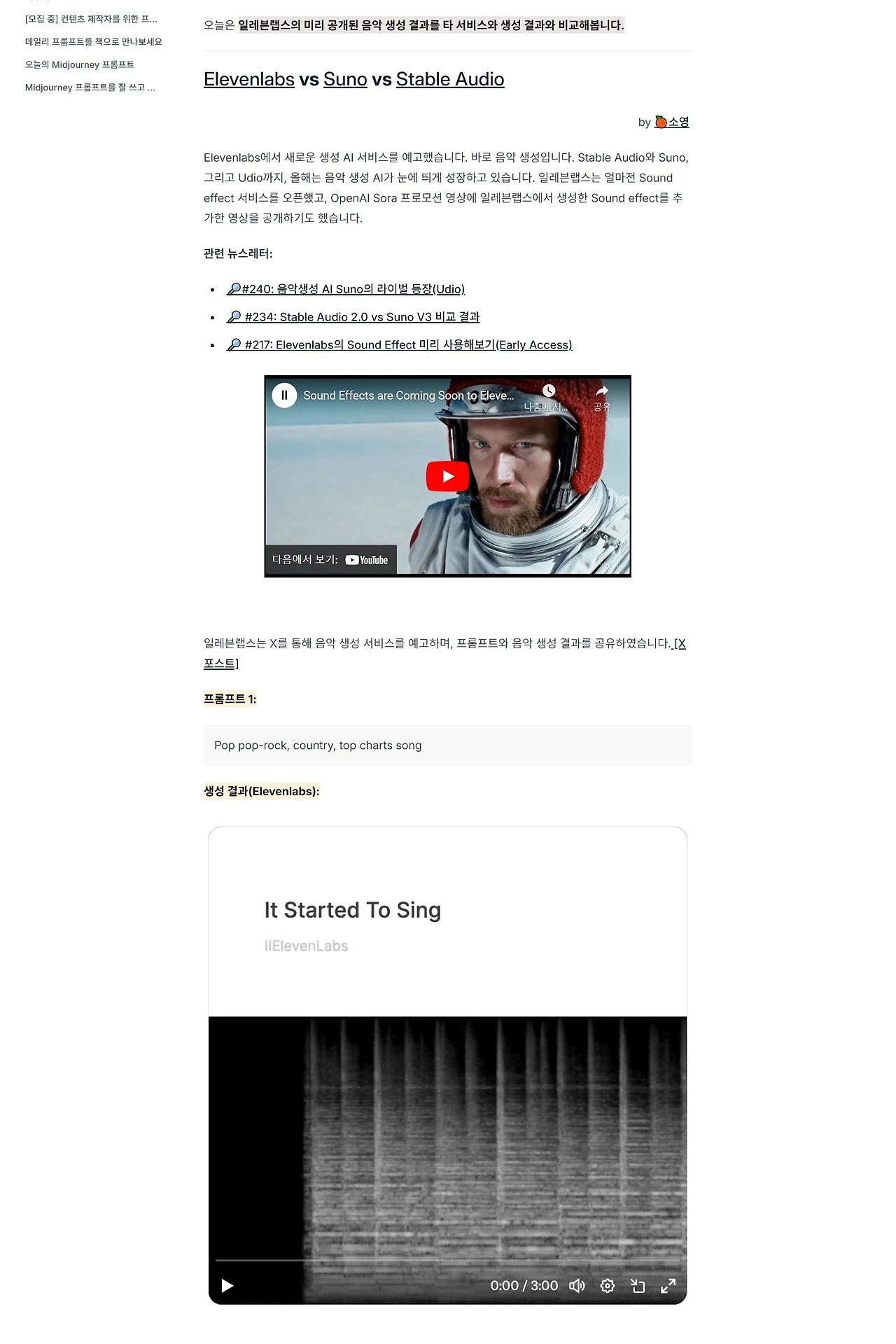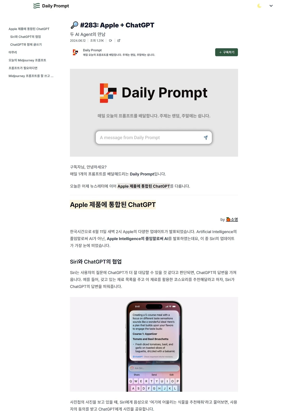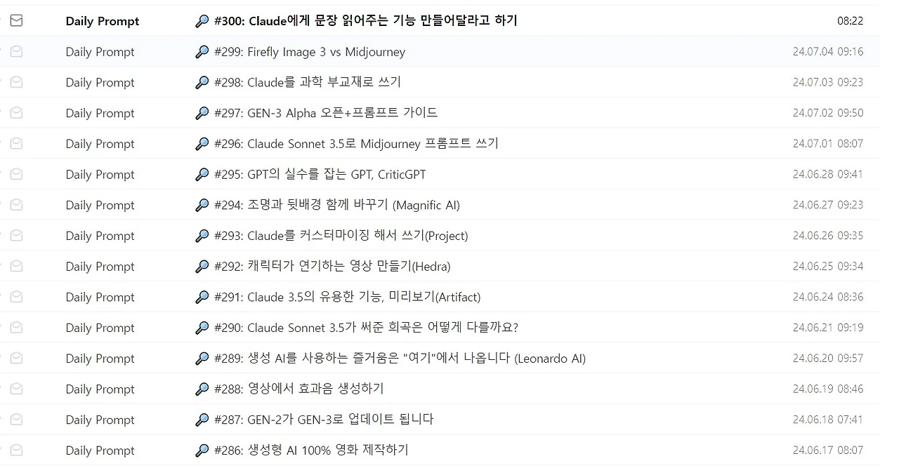 (…)그래서 ‘Daily Prompt’를 기획해, 주중 매일 짧은 뉴스레터를 발송하기로 결정했다. 앞서 언급한 ‘부끄러움’을 없애고 AI에 대한 나의 지식을 증진하려는 의도도 있었지만, 가장 큰 목적은 AI를 활용하고 싶은데 어떤 프롬프트를 사용해야 할지 막막한 이들에게 도움을 주고 싶었다.(…)