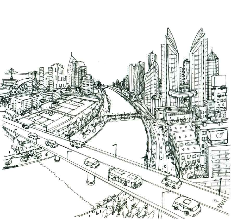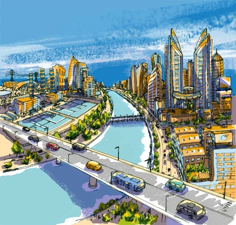 왼쪽으로는 정화시스템,시설공사들이 오른쪽으로는 주거와 공원, 상업지구를 배치하였습니다.
