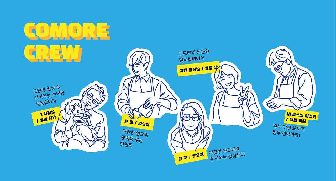 오랜 단골 카페 꼬모레. 5주년을 맞이하여 포스터 디자인과 크루소개 일러스트 작업을 하였습니다.