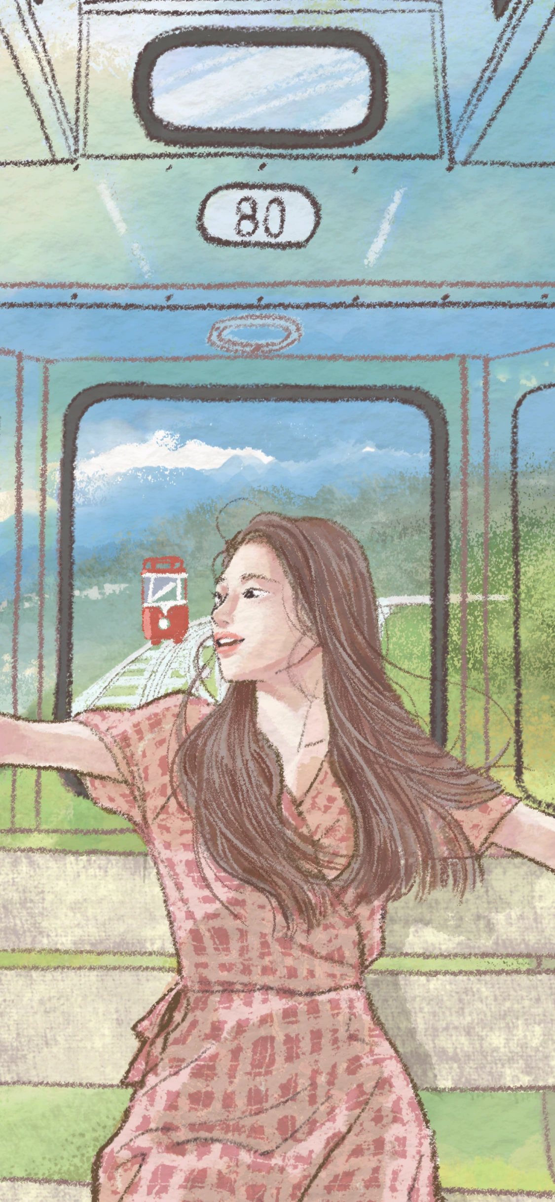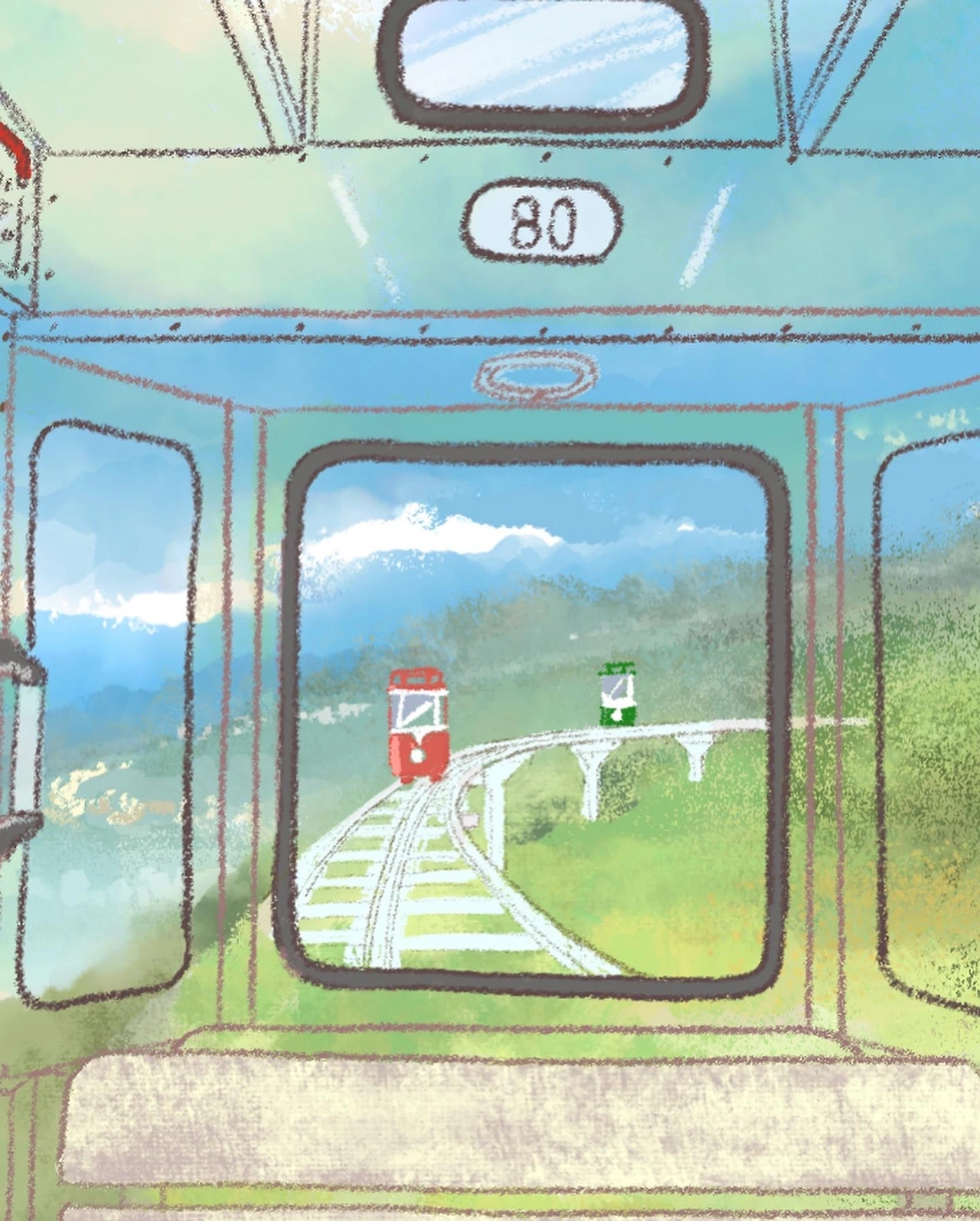 미포와 청사포를 잇는 아주 작은 열차. 스카이 캡슐을 소개합니다. 공중에서 감상하는 해안 절경. 일본에서 보았던 한량 짜리 열차보다도 작은 공간으로 최대 4인까지 탑승 가능한 프라이빗한 열차(?)에요. 그림에는 없지만 의자 앞에 작은 테이블도 있어서 도란 도란 이야기하며 사진도 찍고 즐기기 좋답니다.